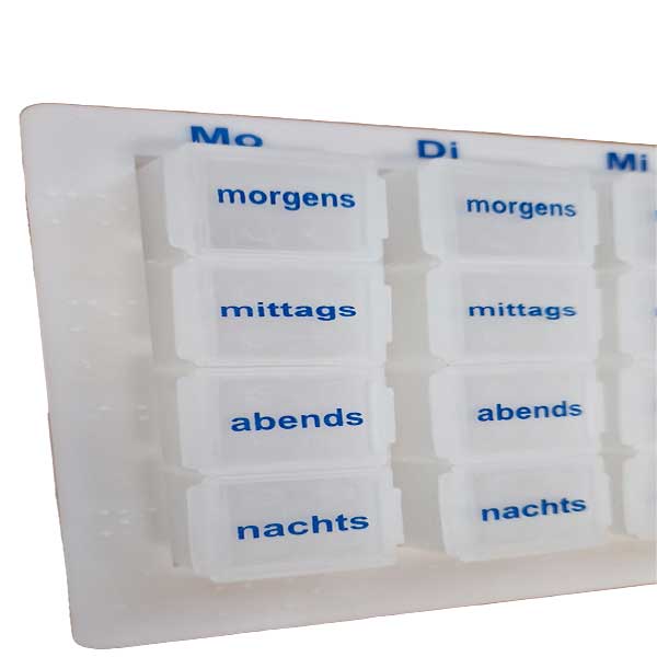 Der tägliche und wöchentliche Überblick zur Medikamenteneinnahme. Die täglichen 4 Fächer können aus dem Tablett herausgelöst und bei Bedarf einzeln mitgenommen werden. Beschriftung: Montag bis Sonntag und morgens, mittags, abends und nachts. Gewicht: 115 g. Gesamtgröße: ca. 21,5 x 13 x 2 cm,